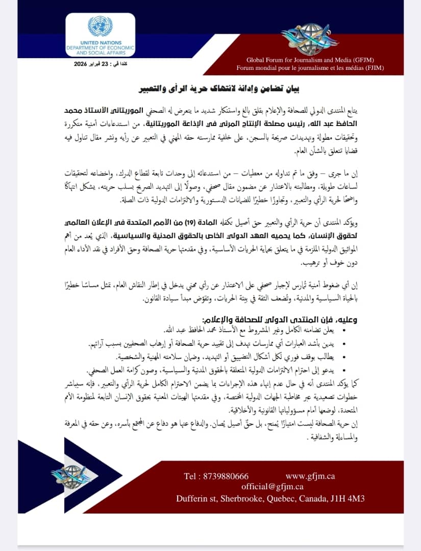 أعرب المنتدى الدولي للصحافة والإعلام عن قلقه البالغ واستنكاره الشديد لما قال إنه تعرض له الصحفي الموريتاني الأستاذ محمد الحافظ عبد الله، رئيس مصلحة الإنتاج المرئي في الإذاعة الموريتانية، من استدعاءات أمنية متكررة وتحقيقات مطولة وتهديدات صريحة بالسجن، على خلفية نشره مقالاً تناول فيه قضايا تتعلق بالشأن العام.