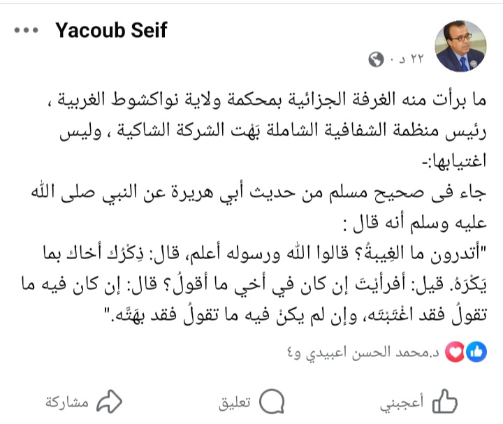 ما برأت منه الغرفة الجزائية بمحكمة ولاية نواكشوط الغربية ، رئيس منظمة الشفافية الشاملة بَهْت الشركة الشاكية ، وليس اغتيابها:-