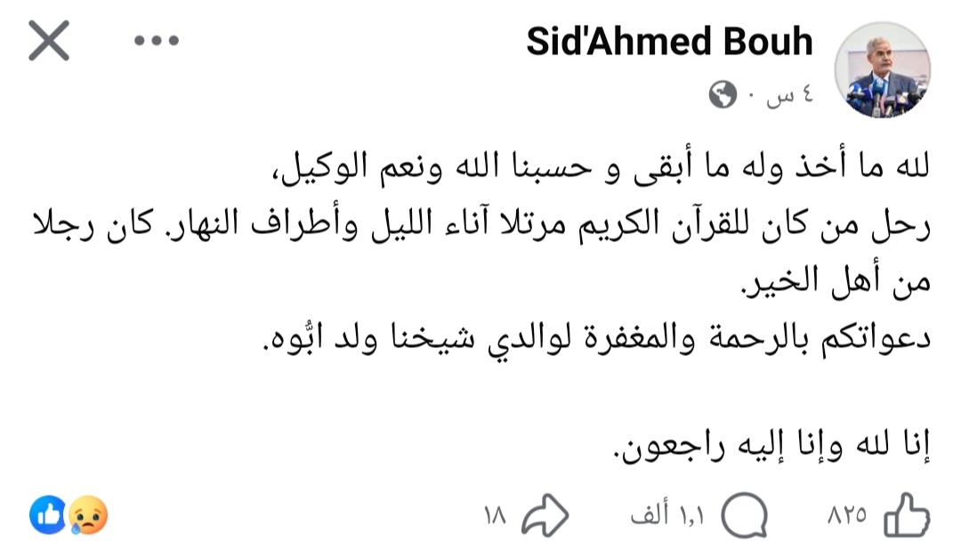 نعى وزير الزراعة السابق سيد أحمد ولد ابوه صباح اليوم والده شيخنا ولد ابوه.