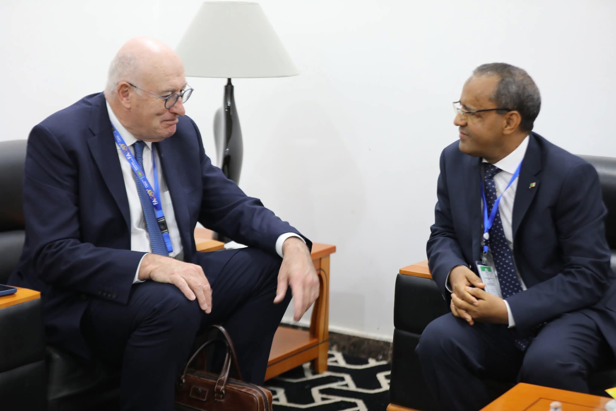التقى معالي وزير الزراعة والسيادة الغذائية، السيد محمدو أحمدو امحيميد، بالسيد فيل هوغان، المفوض الأوروبي السابق للتجارة والزراعة والتنمية الريفية، على هامش الدورة الرابعة والثلاثين للمؤتمر الإقليمي لإفريقيا، المنظم من طرف منظمة الأمم المتحدة للأغذية والزراعة (الفاو).