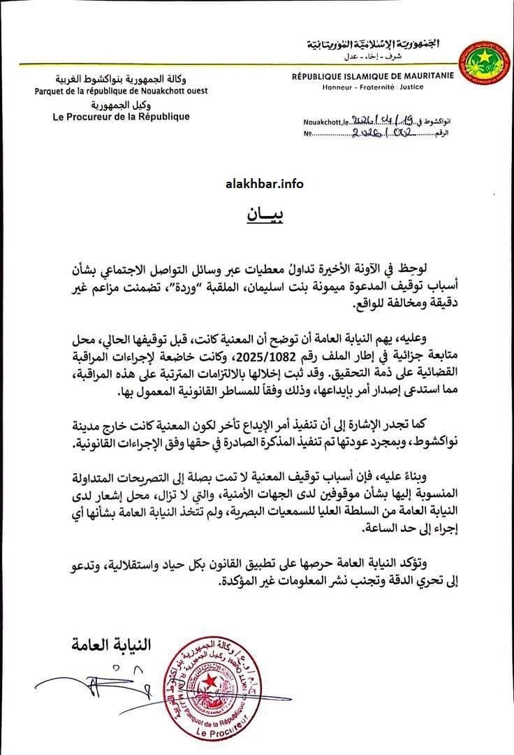 وذكرت النيابة بأن بنت اسليمان كانت، قبل توقيفها الحالي، محل متابعة جزائية في إطار الملف رقم: 1082/2025، وكانت خاضعة لإجراءات المراقبة القضائية على ذمة التحقيق، لافتة إلى أن تنفيذ أمر الإيداع تأخر لكون المعنية كانت خارج مدينة نواكشوط، وبمجرد عودتها تم تنفيذ المذكرة الصادرة في حقها وفق الإجراءات القانونية.
